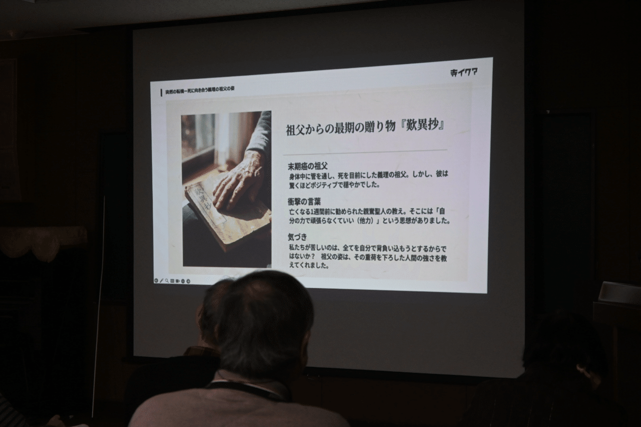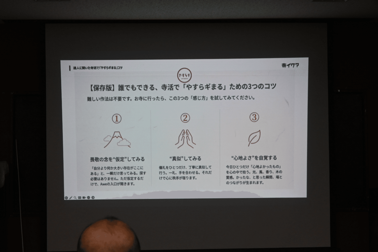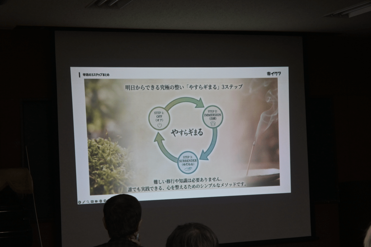 最後に、まずは気軽に近くのお寺を訪れてみること、そしてそこで心地よさを感じることが「やすらギまる」体験の入り口になると語られ、第一部の講演は締めくくられました。