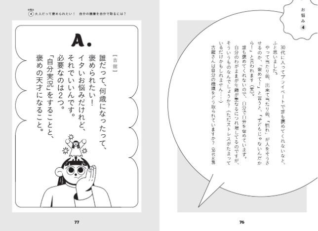 小野: どこから読んでも面白いので、気になるお悩みから読んでいただければと思います。どのエピソードもズバッと解決策が示されるわけではなく、最後まで読んでも何が解決したのかわからないこともあります。 しかし、その一直線ではない寄り道をする古舘󠄁さんの喋りが、タイパ(タイムパフォーマンス)を重視してすぐに答えを求める今の20代・30代の方には逆に新鮮で、楽しんでもらえるのではないかと思っています。ゆったりしながら本を読む体験を通して、そういう楽しみ方もあるんだと再発見してもらえたら嬉しいです。